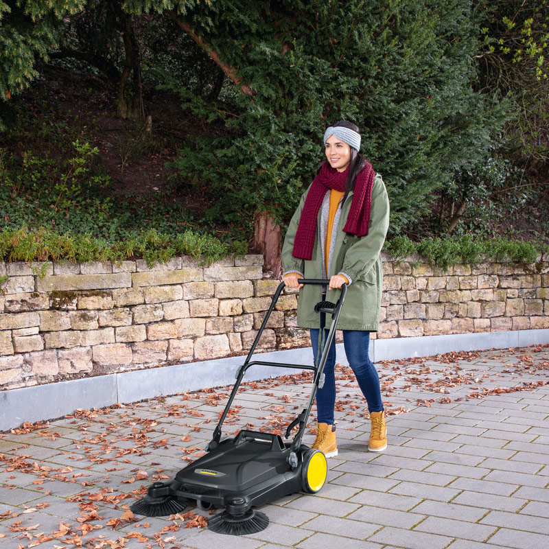 При необходимости подметальную машину для экономии места можно легко сложить, не наклоняясь, с помощью подножки на раме и затем переносить за ручку. Благодаря креплению боковых щеток без использования инструментов подметальная машина сразу готова к работе.
